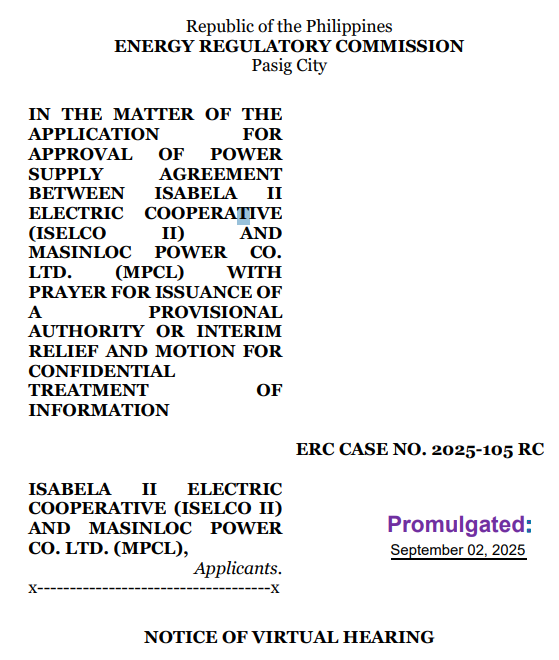 NOTICE OF VIRTUAL HEARING IN ERC CASE NO. 2025-105 RC OGCS-LEG-PROM 1488-2025 NVH 2025-105 RC 2Sept2025Download Previous Next